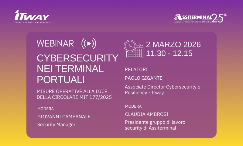 Assiterminal, in collaborazione con ITWAY, organizza il webinar “Cybersecurity nei Terminal Portuali – Misure operative alla luce della Circolare MIT 177/2025”, in programma lunedì 2 marzo 2026, dalle ore 11.30 alle ore 12.15.